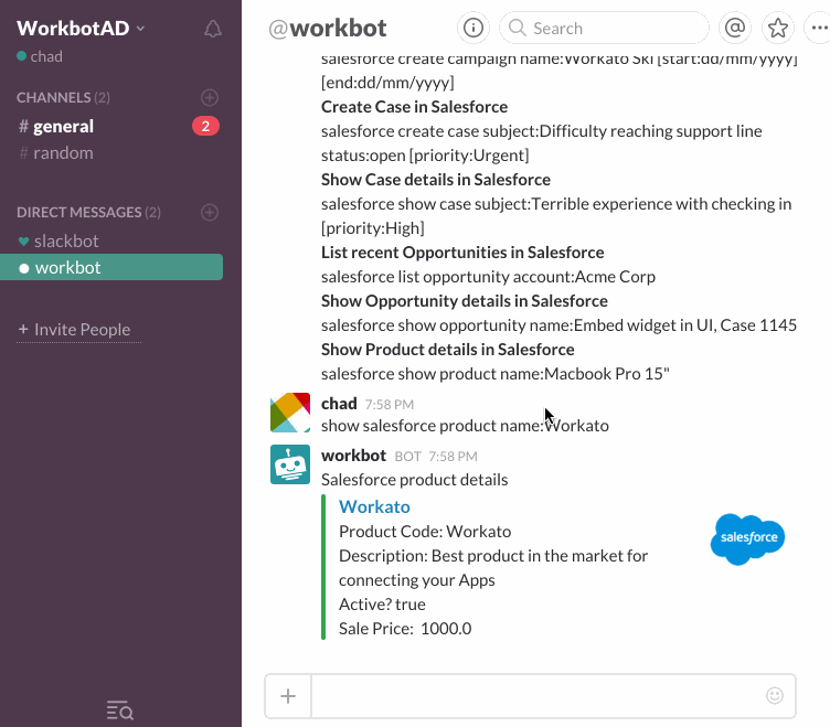 Workbot experience = Workato Recipes + Bot Commands + Bot notifications.