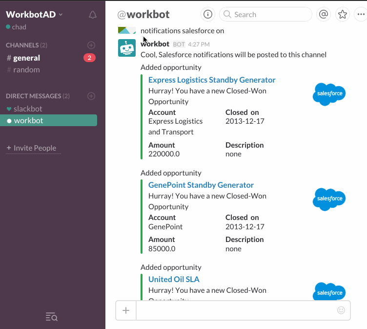 Bots can also listen for activity inside the app and notify you of events of interest. For example in the example below, it is looking for Closed/Won notifications and sending it to the channel. It will send it to the channel from where the notifications were enabled. You can create our own notifications or modify existing ones to suit your needs.
